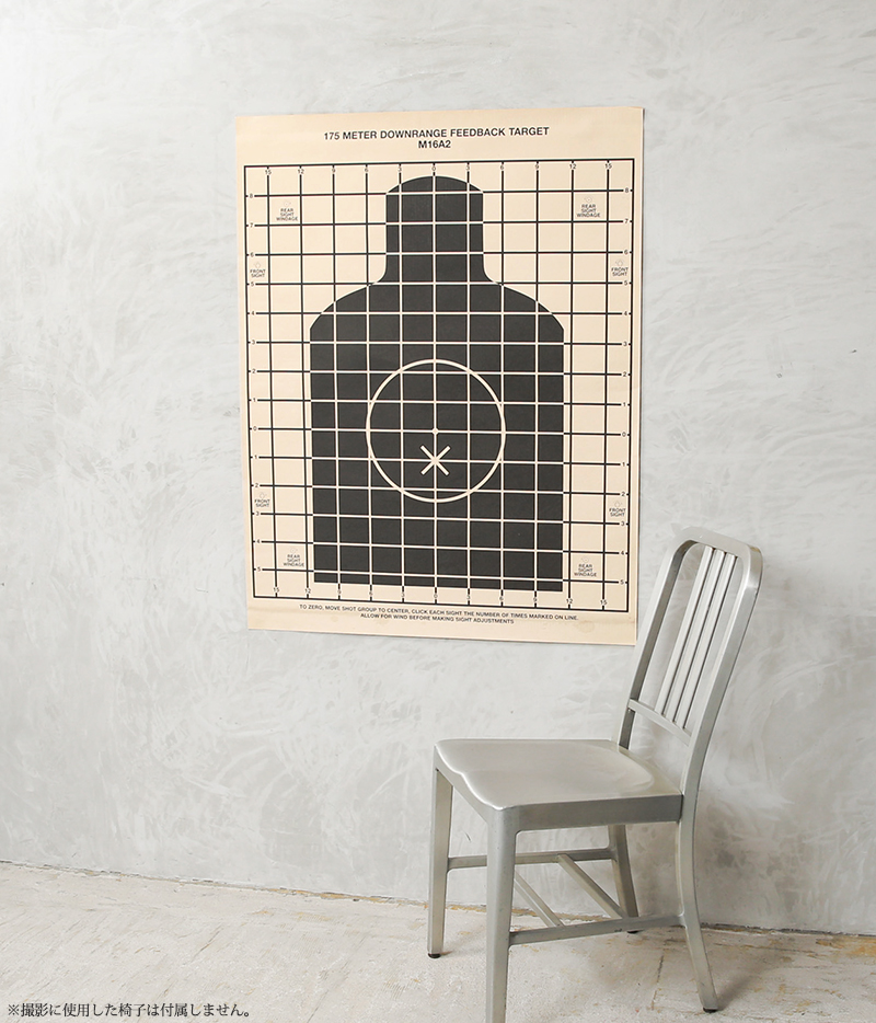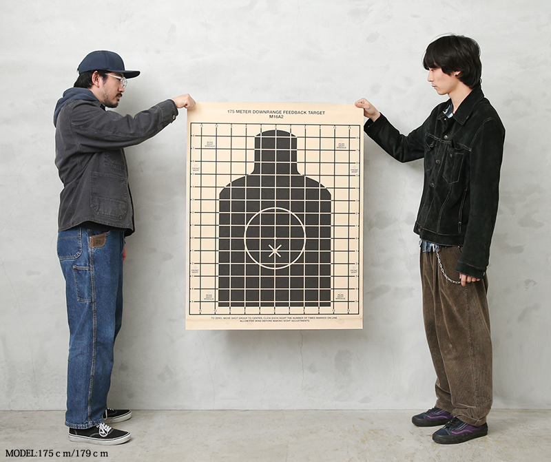 アメリカ軍で実弾による射撃訓練やゼロイン手順に使用される、M16A2ダウンレンジ・フィードバック・ターゲットと呼ばれる射撃用の的が登場。主にM16A2、M16A4、およびM4カービンライフルの射撃訓練、精密射撃の練習、資格試験などで使用され、25メートルの近距離から175メートルや300メートルといった長距離を射撃した際の効果をシミュレートします。丈夫で重厚な紙製で、通常では散見できない大き目のリアルなサイズ感。ターゲットは、中央の照準点と、射撃グルーピングの測定や正確な風偏と仰角の調整に用いられるグリッドシステムを備えたシルエットを特徴としています。独特な質感とミリタリーアイテムならではの雰囲気が魅力的で、お部屋やガレージ、また店舗装飾など、インテリアとして飾っても画になる一枚です。
