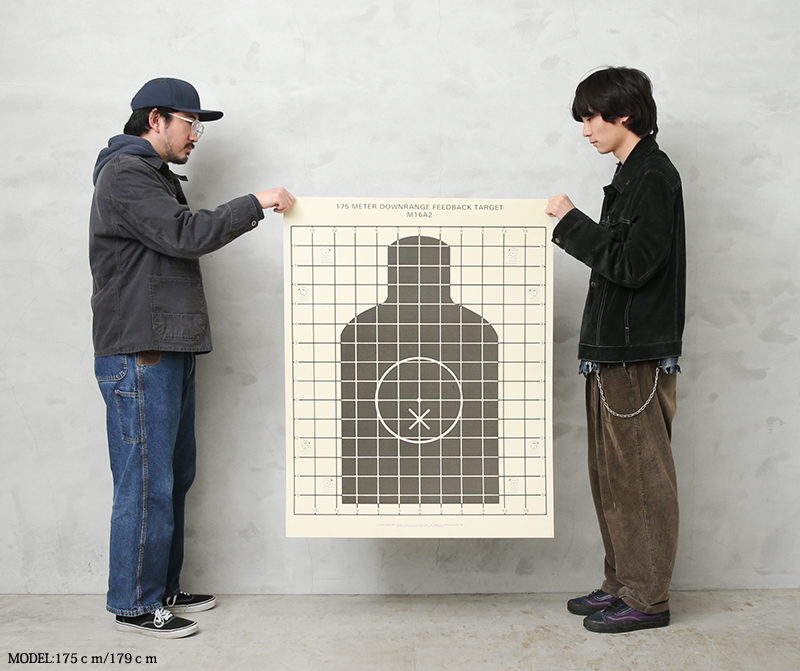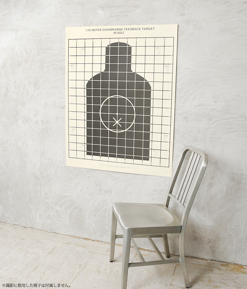 アメリカ軍で実弾による射撃訓練やゼロイン手順に使用される、M16A2ダウンレンジ・フィードバック・ターゲットと呼ばれる射撃用の的が登場。主にM16A2、M16A4、およびM4カービンライフルの射撃訓練、精密射撃の練習、資格試験などで使用され、25メートルの近距離から175メートルや300メートルといった長距離を射撃した際の効果をシミュレートします。丈夫で重厚な紙製で、通常では散見できない大き目のリアルなサイズ感。ターゲットは、中央の照準点と、射撃グルーピングの測定や正確な風偏と仰角の調整に用いられるグリッドシステムを備えたシルエットを特徴としています。独特な質感とミリタリーアイテムならではの雰囲気が魅力的で、お部屋やガレージ、また店舗装飾など、インテリアとして飾っても画になる一枚です。