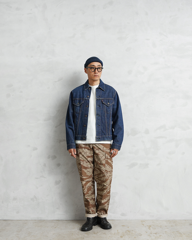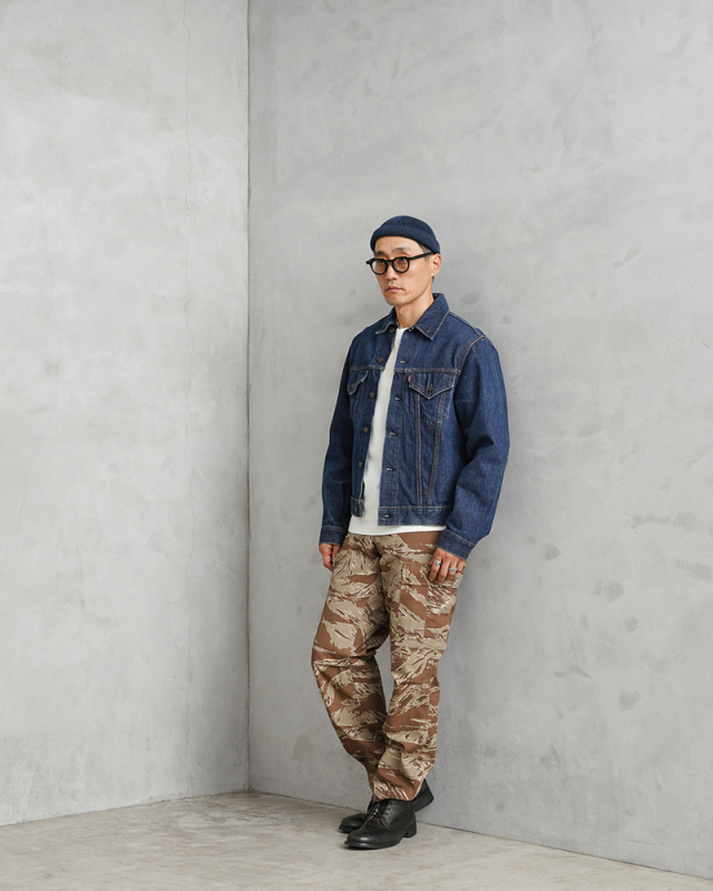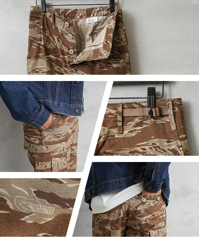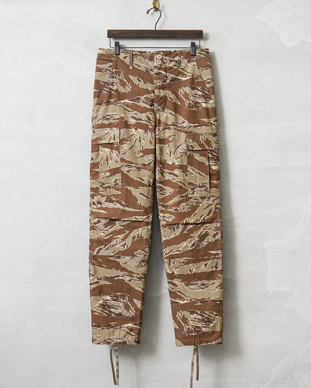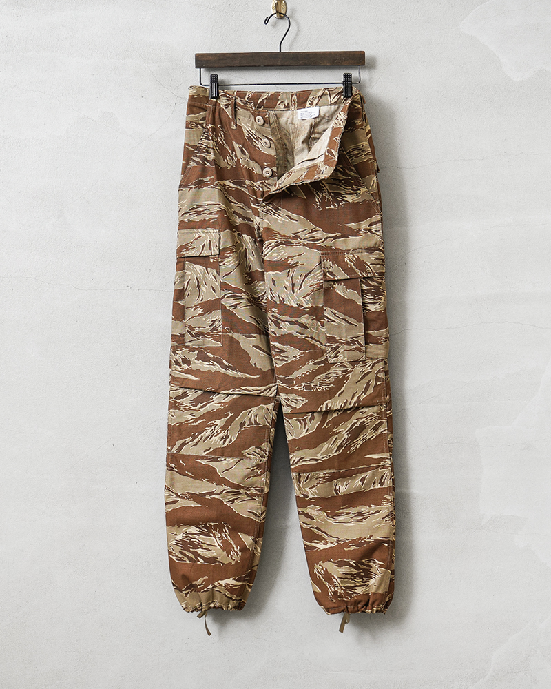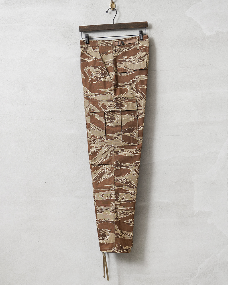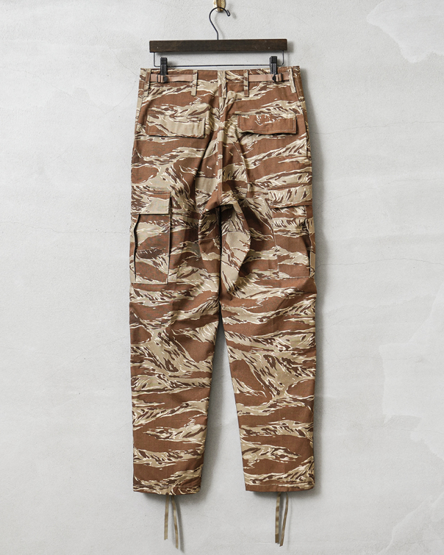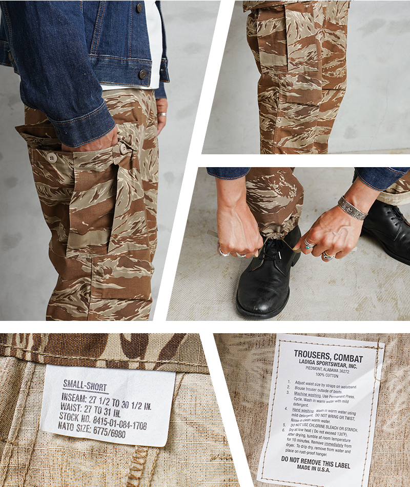 2000年代頃に米軍の民間モデル(Commercial Model)として耐久性の高いジャングルファティーグジャケットやコンバットパンツを生産していた実績で知られる、米国アラバマ州ピードモントを拠点とする、ハンティングウェアやミリタリーアイテムを製造・販売する地元のメーカー「LADIGA SPORTSWEAR」社製BDUカーゴパンツ。米軍の制式迷彩(BDUなど)として全面採用されたわけではありませんが、その高い秘匿性と「特殊部隊らしさ」から、多くの隊員が民間のメーカーから購入して使用するほど密かに人気だった「デザートタイガーストライプ(Desert Tiger Stripe)」が特徴です。
