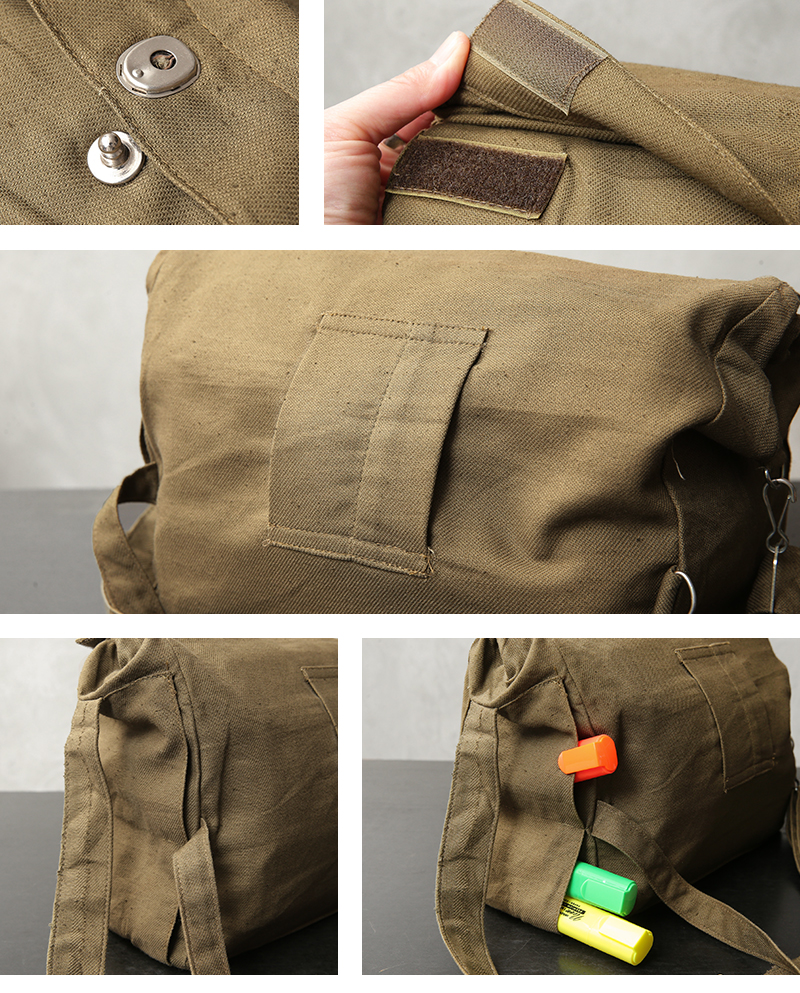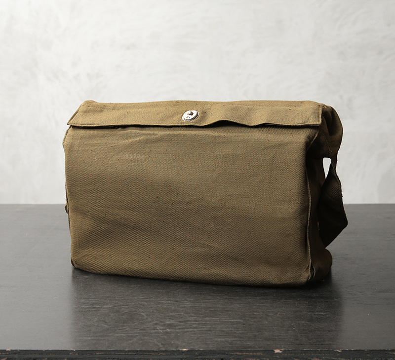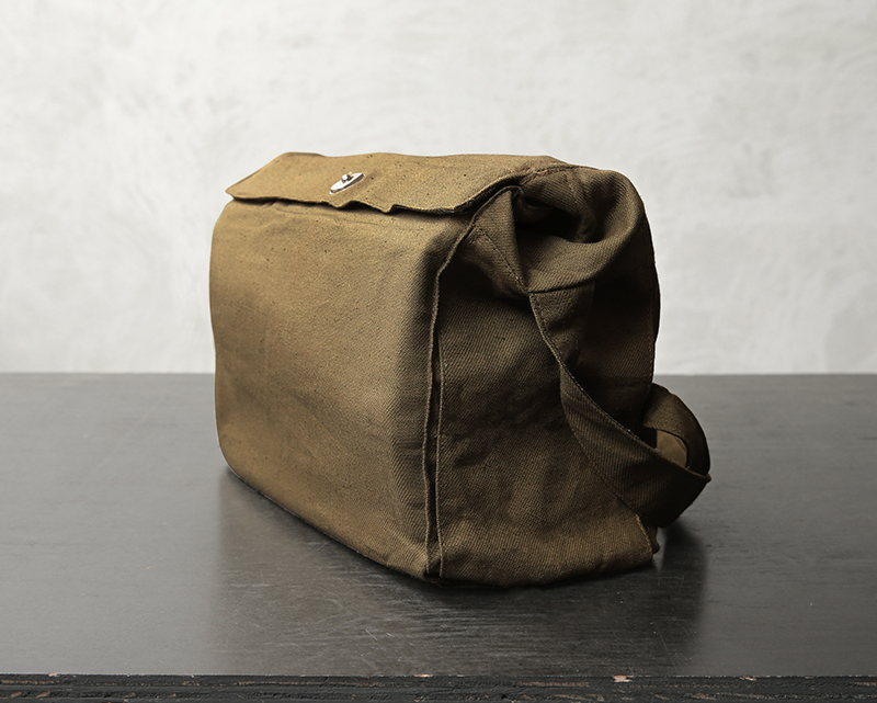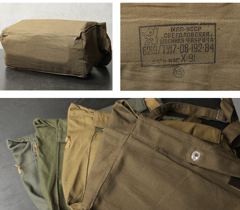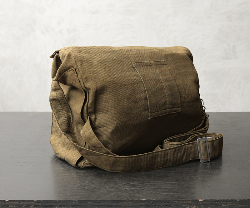 1930年代~1980年代のソ連時代に採用されていた、汎用軍用ガスマスクを持ち運ぶためのガスマスクバッグです。当時から軍や公的機関向けの装備品を手掛けていたスヴェルドロフスク縫製工場で製作されており、シンプルな作りながらヴィンテージの風合いが目を惹く一品。程よい厚さで軽量ながら耐久性の高いキャンバス地に、肩と腰を固定し安定させる二本のストラップ。サイドやメインコンパートメントに仕切りポケットが多数あり、財布やスマートフォン、ルームキーなど十分に収納できる使い勝手の良い仕様になっています。ボタンとベルクロの二段開閉で、使用は簡単ながらしっかりと荷物を守ることができます。
