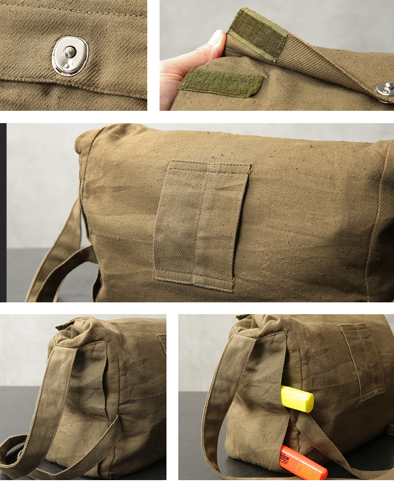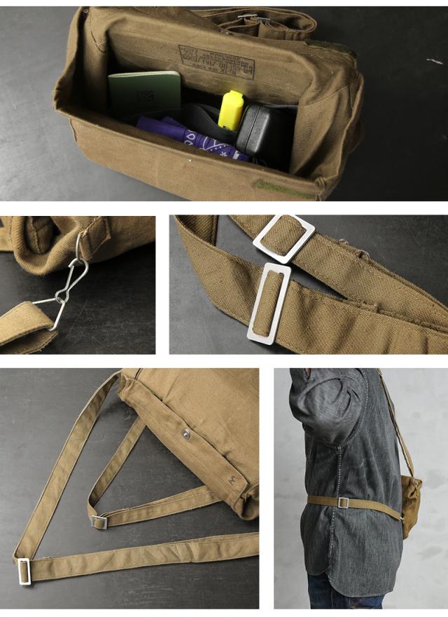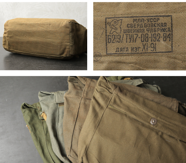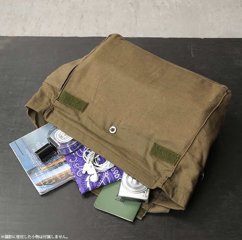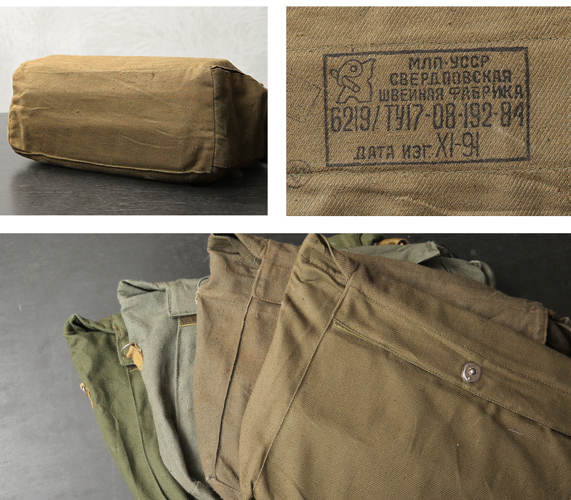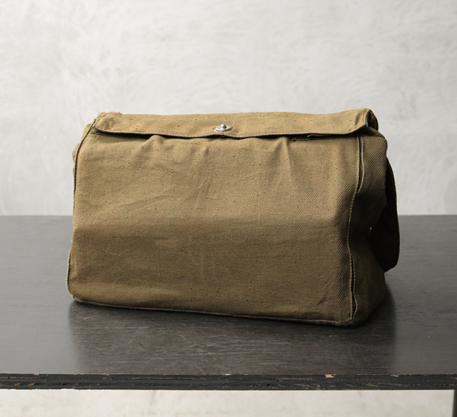 1930年代~1980年代のソ連時代に採用されていた、汎用軍用ガスマスクを持ち運ぶためのガスマスクバッグです。当時から軍や公的機関向けの装備品を手掛けていたスヴェルドロフスク縫製工場で製作されており、シンプルな作りながらヴィンテージの風合いが目を惹く一品。程よい厚さで軽量ながら耐久性の高いキャンバス地に、肩と腰を固定し安定させる二本のストラップ。サイドやメインコンパートメントに仕切りポケットが多数あり、財布やスマートフォン、ルームキーなど十分に収納できる使い勝手の良い仕様になっています。ボタンとベルクロの二段開閉で、使用は簡単ながらしっかりと荷物を守ることができます。