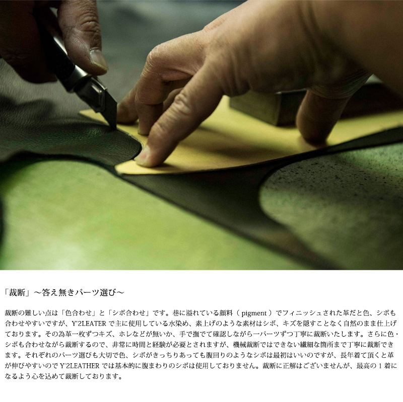 | ブランド | ![]() 1998年に創業し裁断、縫製などの工程を大阪の自社工房で行う総合レザーメーカーです。「革」は布帛とは異なり生もの。素材、裁断、縫製等すべてに置いて同じモノは生まれません。その時の1着が出会いです。その1着を最高の出会い、どこかあたたかさを感じて頂けるよう、そう願いながら、ひとつひとつの分野で丁寧に想いを込めて作っています。革の業界に携わり40 年余り。Y'2LEATHER の最大の強みは熟練した職人達です。各工程に於いて「妥協なきこだわり」を信念に、モノづくりをしています。 その他のY'2 LEATHER ワイツーレザーはこちら |