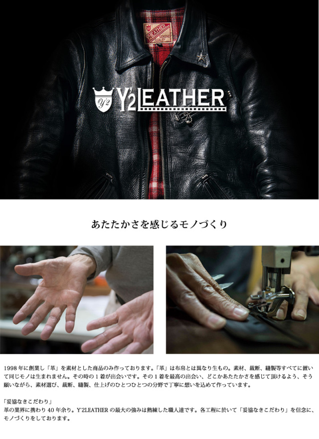 | ブランド | ![]() 1998年に創業し裁断、縫製などの工程を大阪の自社工房で行う総合レザーメーカーです。「革」は布帛とは異なり生もの。素材、裁断、縫製等すべてに置いて同じモノは生まれません。その時の1着が出会いです。その1着を最高の出会い、どこかあたたかさを感じて頂けるよう、そう願いながら、ひとつひとつの分野で丁寧に想いを込めて作っています。革の業界に携わり40 年余り。Y'2LEATHER の最大の強みは熟練した職人達です。各工程に於いて「妥協なきこだわり」を信念に、モノづくりをしています。 その他のY'2 LEATHER ワイツーレザーはこちら |