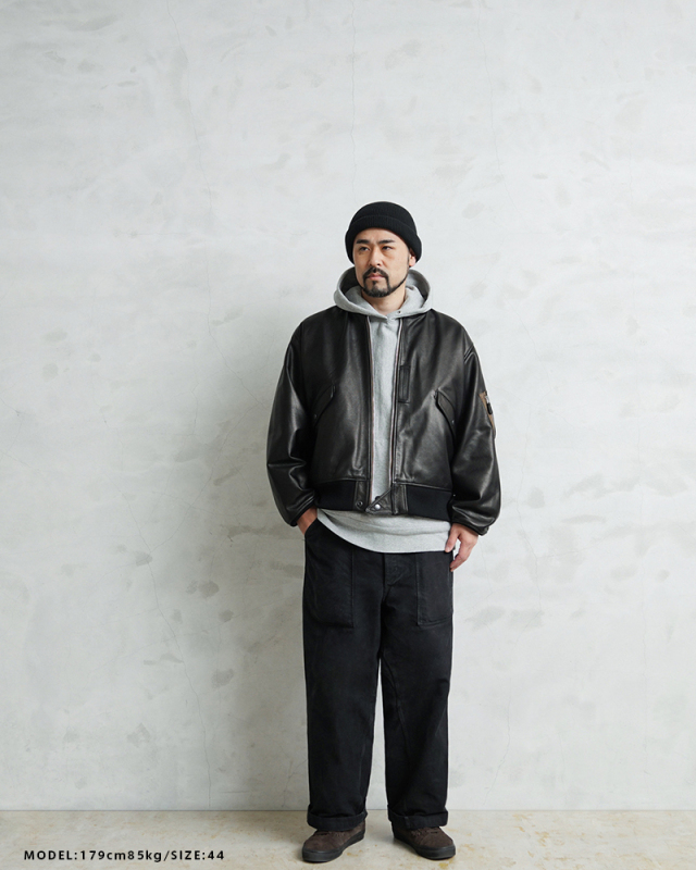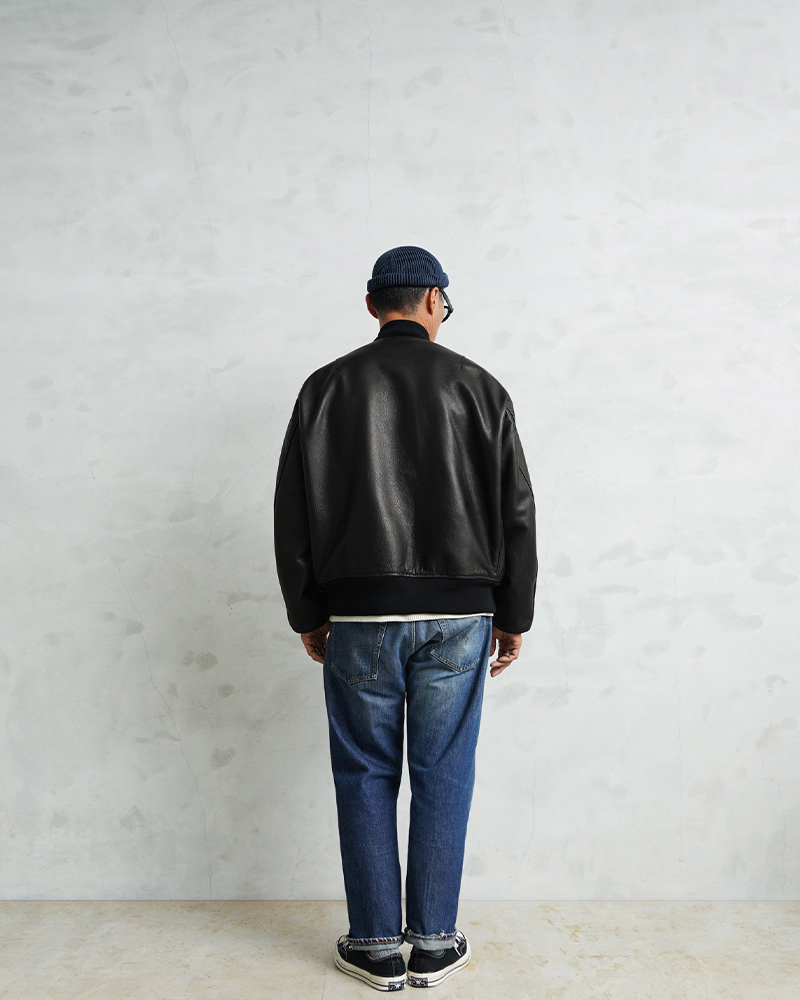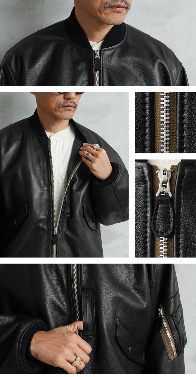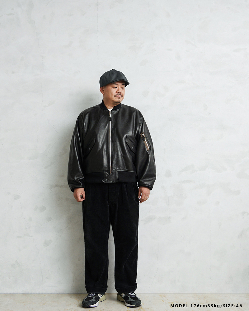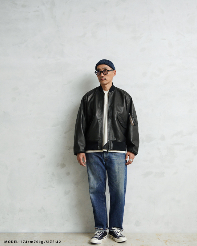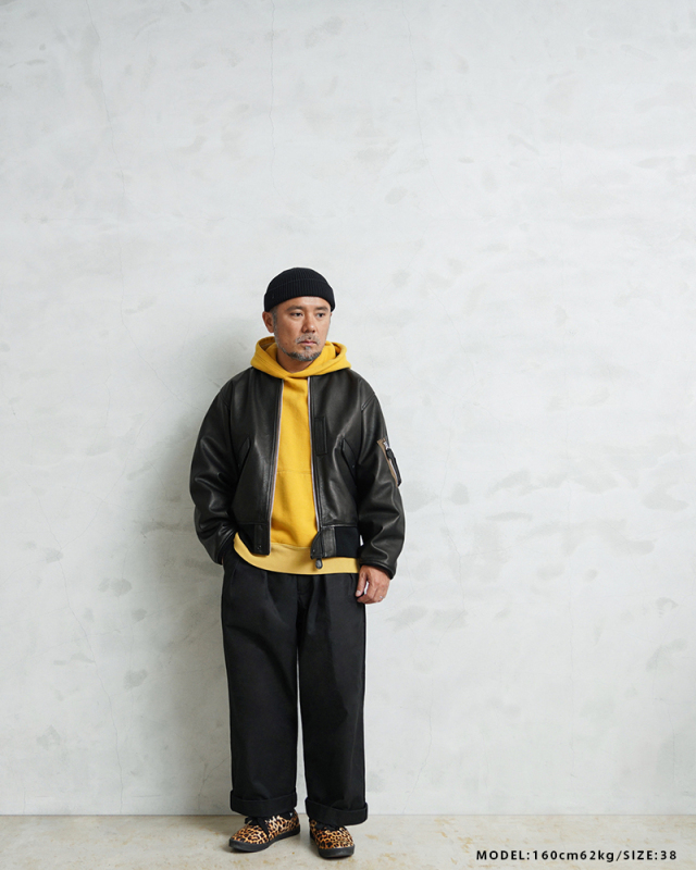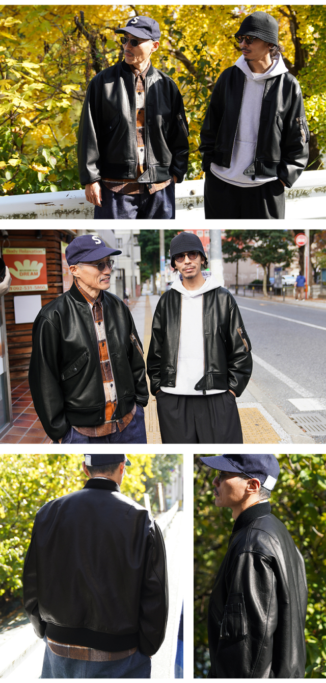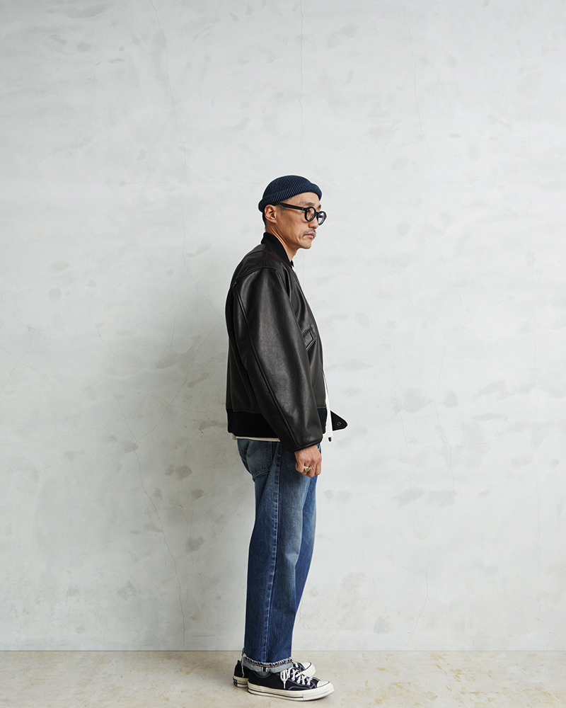 Y'2 LEATHER ワイツーレザー WAIPER別注 ステアオイル レザージャケット TYPE U.S.AIRFORCE L-2 FLIGHT のご紹介です。 1945年にA-2の後継として登場したL-2は、ライト・ゾーン(10℃~30℃)と呼ばれる温度域での着用が想定された軽量なフライトジャケット。1978年に新たに採用されたCWU-36/Pの登場まで、幾度もマイナーチェンジを重ねた息の長いジャケットです。 様々なブランドもサンプリングする米軍の名作をY'2LEATHERが誇る熟練の職人技と上質なステアハイドで仕上げたスペシャルな別注アイテムです。染色には”水染め”という技法を使用しています。専用のドラムの中で水と油と染料を混ぜたものにつけこみ、ゆっくり、しっかり油と色を入れていくことで革はやわらかい仕上がりに。時間と手間がかかりますが、上質な着心地と強度を持ち合わせた最高の一着に仕上がっています。 サイジングは当店オリジナルのL-2で定評のあるデザインを踏襲させております。実物を分析しアームホールの立体的な構造までこだわりぬいて作り上げたパターン。着用した際に生地のドレープが綺麗に見えるこだわりのシルエットです。 風合い豊かでありながらシープのようなしなやかさと着やすさを持ち合わせたステアハイドは、このシルエットに非常にマッチするファブリック。羽織りやすくリラックス感のある着心地で、レザー初心者の方や女性の方にもオススメな一着となっております。 フラップ付きのポケットや左袖のシガーポケット、フロントのホースタブ、裾の三角フラップなどL-2ならではのディテールはしっかりと再現しつつ、エポレットを廃し、シンプルに仕上げたコーデに使いやすい仕様です。裏地にはなめらかで肌触りの良いキュプラを使用。袖通しもよく静電気が起こりにくいのも特長です。 内側襟元のネームはミリタリーデザインだからこそのU.S.AIR FORCEロゴをモチーフにしたデザイン。ジッパーテープはカーキ色が使用され、ビンテージミリタリーテイストな雰囲気も感じられます。着こむほどにあらわれる磨いたような艶など経年変化もこちらの革の魅力。 生涯愛していただける一着としてお届けできればと思います。 MADE IN JAPAN |
