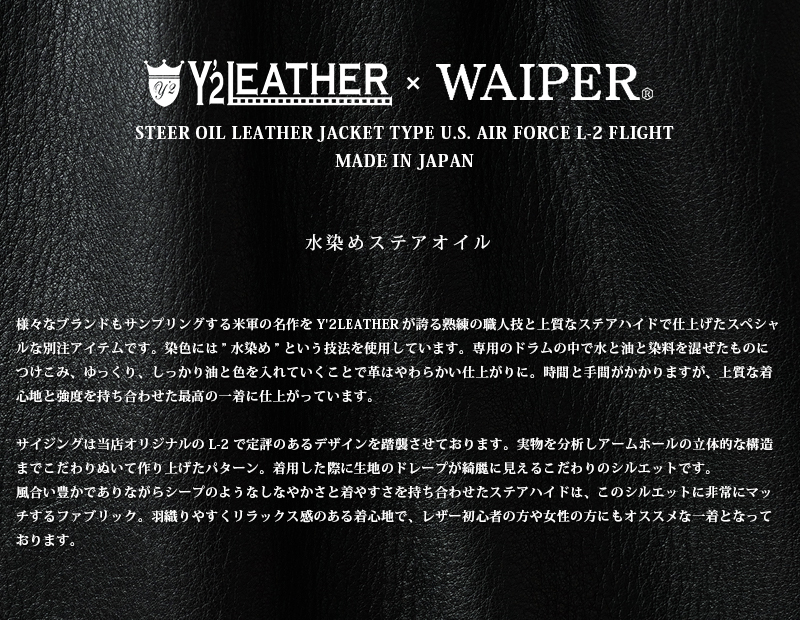 | 商品名 | Y'2 LEATHER ワイツーレザー WAIPER別注 ステアオイル レザージャケット TYPE U.S.AIRFORCE L-2 FLIGHT MADE IN JAPAN |