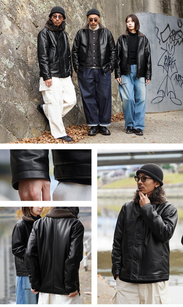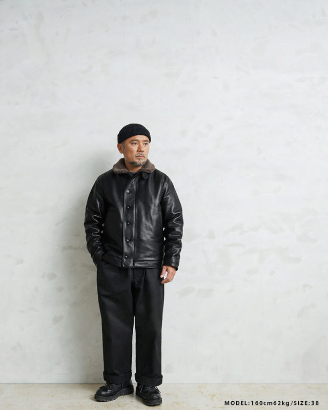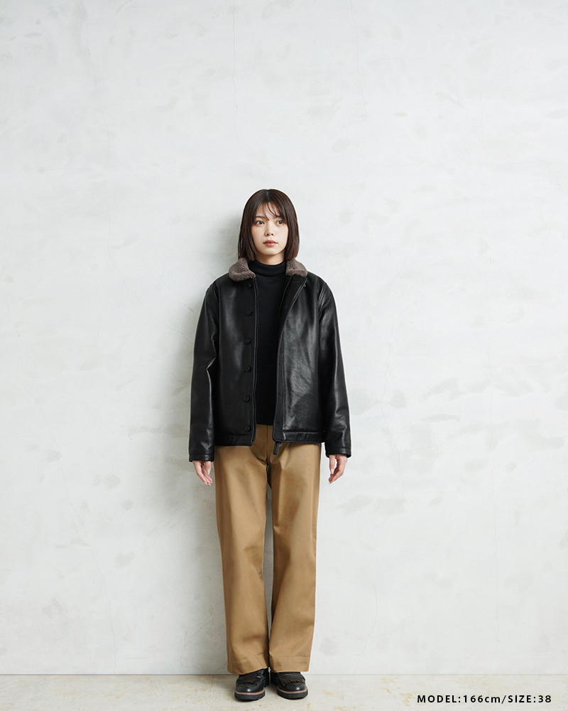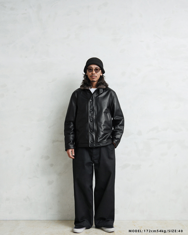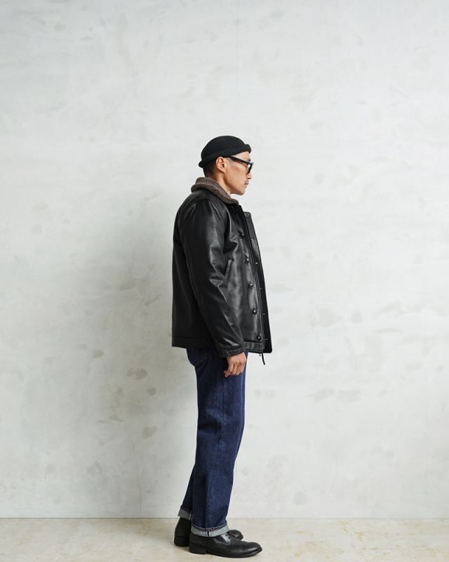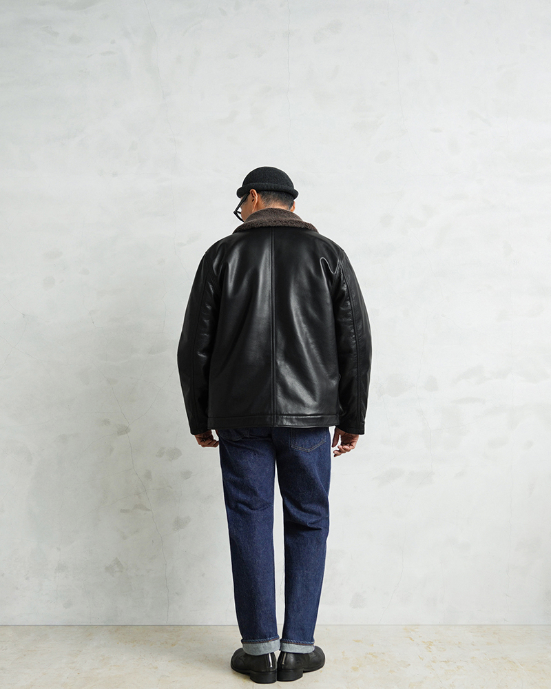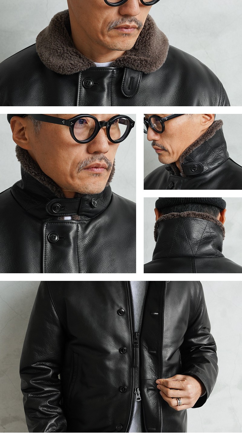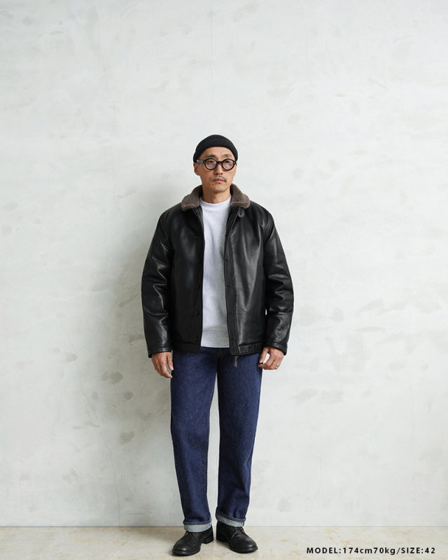 Y'2 LEATHER ワイツーレザー WAIPER別注 ステアオイル レザージャケット TYPE U.S.NAVY N-1 DECK JKT MADE IN JAPAN のご紹介です。 冬の艦上や港での作業用として開発され、1943年に制式採用された、冬のミリタリージャケットとして名高いN-1デッキジャケット。味のあるコットングログランにボアのライニングを採用した非常に防寒性の高い一着。アメカジ、ワークスタイルの定番として長きにわたり愛されるアメリカ海軍の名作です。 こちらは名作「N-1」をY'2LEATHERが誇る熟練の職人技と上質なステアハイドで仕上げたスペシャルな別注アイテムです。染色には”水染め”という技法を使用しています。専用のドラムの中で水と油と染料を混ぜたものにつけこみ、ゆっくり、しっかり油と色を入れていくことで革はやわらかい仕上がりに。時間と手間がかかりますが、上質な着心地と強度を持ち合わせた最高の一着に仕上がっています。 襟とライニングにはアルパカブレンドのボアを採用しています。ウールの約8倍の保温性を誇ると言われるアルパカとウール、ポリエステルを絶妙な比率でブレンドしたボアライニングは抜群の保温性と非常に肌触りのよい極上の着心地。風合い豊かでありながらシープのようなしなやかさを持ち合わせたステアハイドとの組み合わせにより、レザージャケットならではの迫力ある雰囲気を放ちつつも、羽織りやすくリラックス感のある着心地で、レザー初心者の方や女性の方にもオススメな一着となっております。 チンストラップ付きの襟周りのデザインやボタン開閉の比翼などN-1デッキジャケットならではのデザインを踏襲しつつ、フロントはダブルジッパーを採用することでバイクや車に乗る際も裾がかさばらない便利な仕様にブラッシュアップ。両サイドのポケット内袋は肌触りの良い起毛トリコットを使用した暖かく気持ちの良いデザインです。 ほどよくゆとりがあり、カジュアルからトラッドなど様々なコーデに使いやすい絶妙なシルエット。袖裏はボアではなくナイロンキルトを使用しており、袖通しが良く羽織りやすいのもポイントです。 着こむほどにあらわれる磨いたような艶など経年変化もこちらの革の魅力。 生涯愛していただける一着としてお届けできればと思います。 MADE IN JAPAN |
