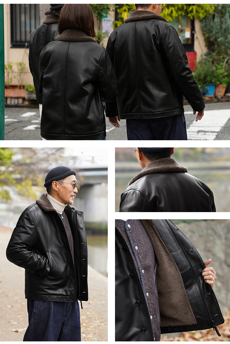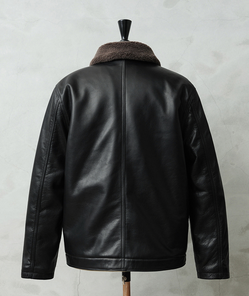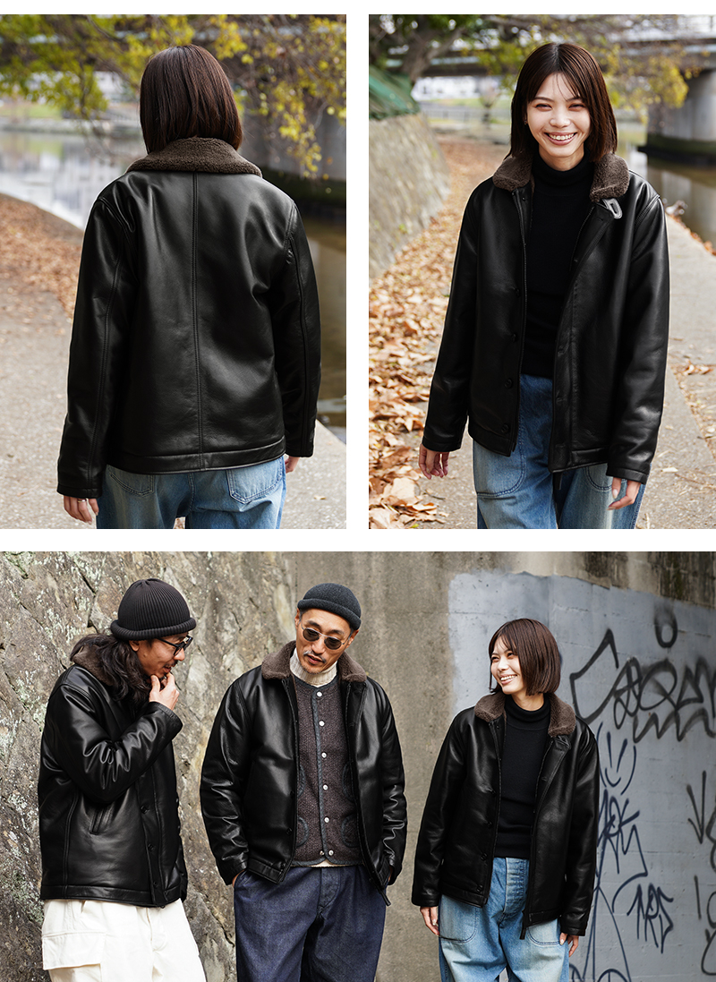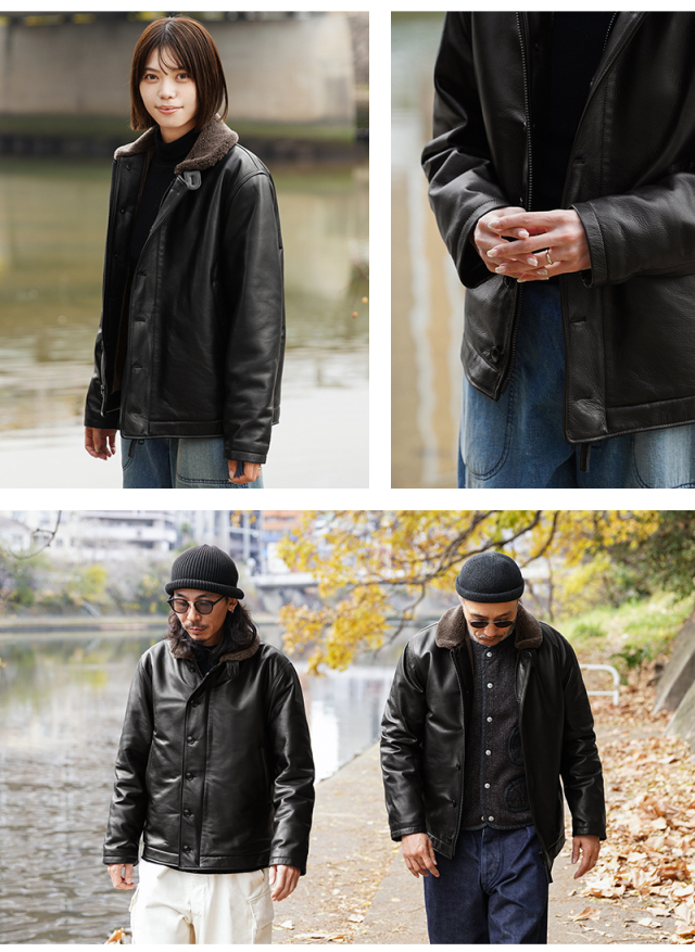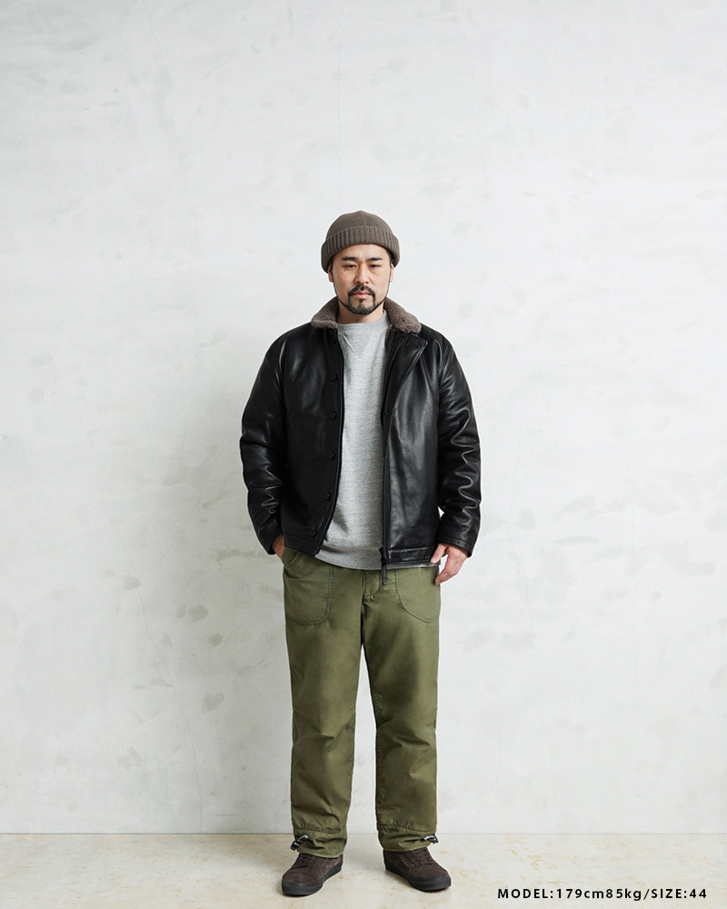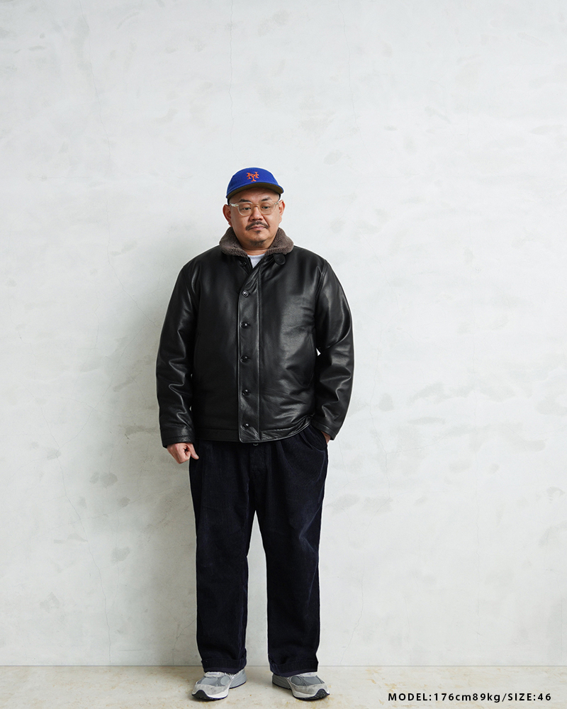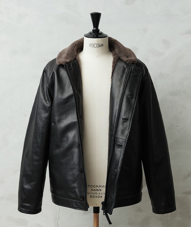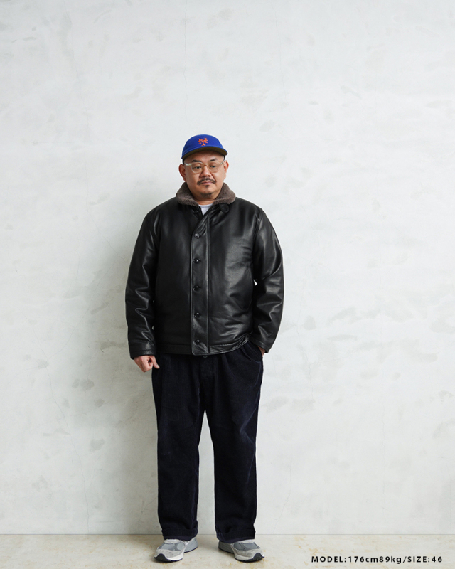Y'2 LEATHER ワイツーレザー WAIPER別注 ステアオイル レザージャケット TYPE U.S.NAVY N-1 DECK JKT MADE IN JAPAN のご紹介です。 冬の艦上や港での作業用として開発され、1943年に制式採用された、冬のミリタリージャケットとして名高いN-1デッキジャケット。味のあるコットングログランにボアのライニングを採用した非常に防寒性の高い一着。アメカジ、ワークスタイルの定番として長きにわたり愛されるアメリカ海軍の名作です。 こちらは名作「N-1」をY'2LEATHERが誇る熟練の職人技と上質なステアハイドで仕上げたスペシャルな別注アイテムです。染色には”水染め”という技法を使用しています。専用のドラムの中で水と油と染料を混ぜたものにつけこみ、ゆっくり、しっかり油と色を入れていくことで革はやわらかい仕上がりに。時間と手間がかかりますが、上質な着心地と強度を持ち合わせた最高の一着に仕上がっています。 襟とライニングにはアルパカブレンドのボアを採用しています。ウールの約8倍の保温性を誇ると言われるアルパカとウール、ポリエステルを絶妙な比率でブレンドしたボアライニングは抜群の保温性と非常に肌触りのよい極上の着心地。風合い豊かでありながらシープのようなしなやかさを持ち合わせたステアハイドとの組み合わせにより、レザージャケットならではの迫力ある雰囲気を放ちつつも、羽織りやすくリラックス感のある着心地で、レザー初心者の方や女性の方にもオススメな一着となっております。 チンストラップ付きの襟周りのデザインやボタン開閉の比翼などN-1デッキジャケットならではのデザインを踏襲しつつ、フロントはダブルジッパーを採用することでバイクや車に乗る際も裾がかさばらない便利な仕様にブラッシュアップ。両サイドのポケット内袋は肌触りの良い起毛トリコットを使用した暖かく気持ちの良いデザインです。 ほどよくゆとりがあり、カジュアルからトラッドなど様々なコーデに使いやすい絶妙なシルエット。袖裏はボアではなくナイロンキルトを使用しており、袖通しが良く羽織りやすいのもポイントです。 着こむほどにあらわれる磨いたような艶など経年変化もこちらの革の魅力。 生涯愛していただける一着としてお届けできればと思います。 MADE IN JAPAN |