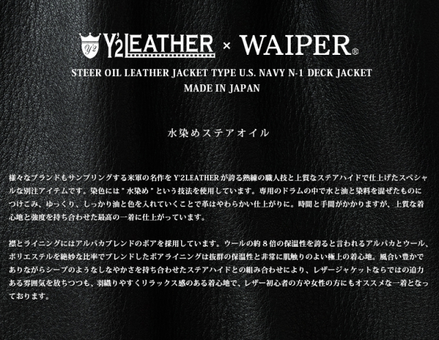 | 商品名 | Y'2 LEATHER ワイツーレザー WAIPER別注 ステアオイル レザージャケット TYPE U.S.NAVY N-1 DECK JKT MADE IN JAPAN |